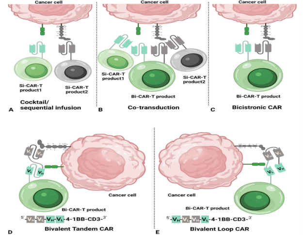 Theoretically, bispecific CAR-T cells can be achieved in the following four ways [7-9]: 1) As shown in 3A, Cocktail/Sequential infusion, that is, monospecific CAR-T cell combination therapy (that is, cocktail therapy). The disadvantage of this combination therapy is that the expansion rates of two different target CAR-T cells in the body are different, which will eventually lead to an imbalance in the ratio of the two CAR-T cells and cannot better eliminate tumor cells; 2) As shown in the figure 3B, Co-transduction, that is, two viral vectors each encode a monospecific CAR molecule, and then the two viruses are co-transduced into T cells to form bispecific CAR-T cells. However, due to differences in transduction efficiency, the ratio of the two CAR molecules on the CAR-T cells formed by this method is unbalanced, and there may also be situations where only one CAR molecule is expressed on the T cells; 3) Figure 3C , Bicistronic CAR-T cells use a viral vector to encode two monospecific CAR molecules, so that there are two CAR molecules on the CAR-T cells. The bispecific CAR-T cells constructed by this method can target two antigens and the ratio of the two CAR molecules is equal. However, the disadvantage of this method is that the viral vector load is limited. The efficiency of the virus encoding two CAR molecules at the same time is low, resulting in a low expression of CAR molecules on CAR-T cells and the expression of the second CAR molecule may be incomplete; 4) As shown in Figure 3D-E, Bivalent CAR-T cells, That is, a virus encodes a CAR molecule, and this CAR molecule contains two antigen-binding sites. The structure of Bivalent CAR-T cells can be divided into two forms: linear tandem (Tandem) or loop (Loop) configuration. These two bivalent CARs are currently the most researched and widely used bispecific CAR-T cell configurations.