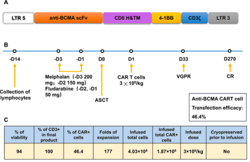 在治疗过程中,虽然患者发生了3级细胞因子释放综合征(CRS)事件,但症状得到很好的控制,且未发生免疫效应细胞相关神经毒性综合征(ICANS)。这是临床首次报道逆转录病毒载体(RV)制备的Anti-BCMA CAR-T细胞联合自体干细胞移植(ASCT)治疗MM患者,证明了深圳evo真人视讯以RV制备的新型Anti-BCMA CAR-T细胞联合ASCT治疗难治性MM患者具有很好的疗效与安全性。现在Anti-BCMA CAR-T临床研究已入组5名MM患者,均取得了可观的疗效。