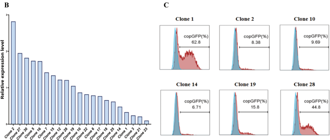 在此基础上,转染BaEV包膜质粒,顺利获得抗性筛选单克隆细胞,对得到的单克隆细胞进行瞬转产毒滴度测试,筛选产毒滴度高且生长状态不受影响的单克隆细胞,即为BaEV逆转录病毒载体的稳定包装细胞株(BaEV-PackRV)。