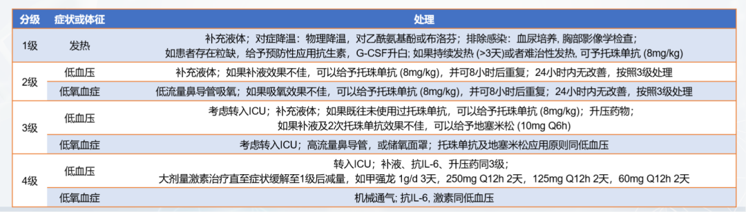 临床上CRS根据严重程度可以分为4个等级,不同等级对应不同的应对方法。