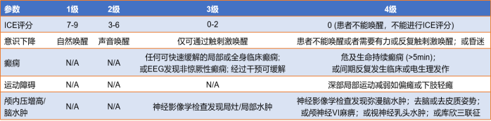 神经毒性或ICANS:免疫治疗后或继发于输注T细胞或内源性免疫效应细胞激活或应答所导致的中枢神经系统的病理过程和功能失调。常见的临床表现为脑病、震颤、头晕、失语和谵妄,严重的致命性事件包括癫痫、白质脑病和脑水[8.9]。神经毒性也有具体的分级和应对方案。